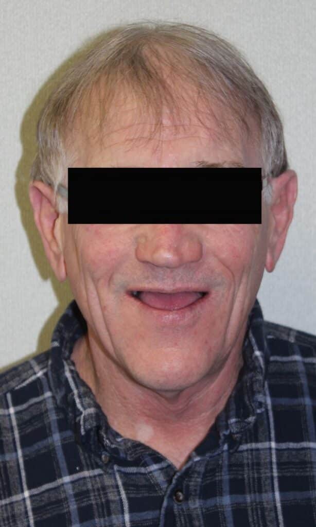 Even though this man had numerous teeth he wasn’t able to eat because none of them occluded. He also had a loss of vertical dimension due to no posterior stops. Two full arch screw retained zirconia restorations completed on 14 implants restored his esthetics and function.